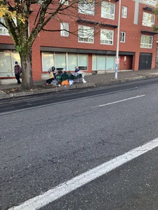 | Description: Bench Camping on SW 13th - Five minutes before I shot this photo the couple was surrounded by four to five men; also a man was using in the half stair of the Gretchen Kafoury Commons building, and another man using in the portico of St. Stephen’s sanctuary. reported at 9:53 am, 19 November 2025 near 45.51603055555555, -122.68772222222222