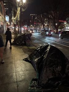 Campus blocking sidewalk where our volunteers come in for Night Strike reported at 6:15 pm, 22 January 2026 near Southwest 3rd Avenue and West Burnside Street