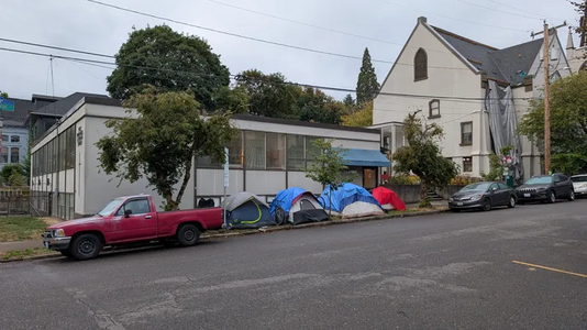 Camp blocking sidewalk reported at 7:32 am, 2 October 2025 near Northwest Irving Street and Northwest 18th Avenue