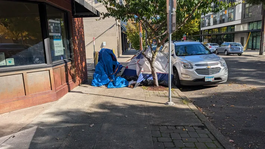 Camp blocking sidewalk reported at 1:50 pm, 21 October 2025 near Northwest Marshall Street and Northwest 17th Avenue