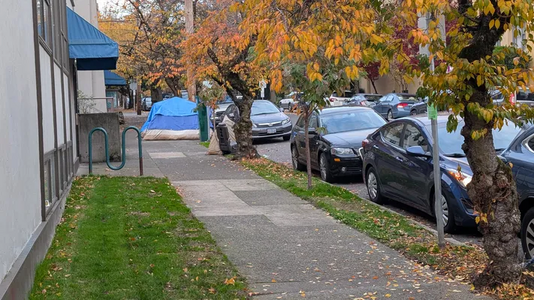 Camp blocking sidewalk reported at 7:42 am, 10 November 2025 near Northwest Irving Street and Northwest 18th Avenue