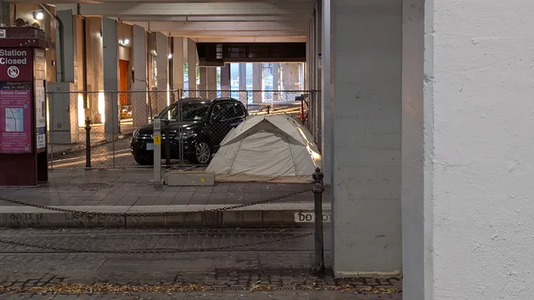 Camp near trimet stop reported at 7:53 am, 15 October 2025 near Northwest 1st Avenue and Southwest 1st Avenue