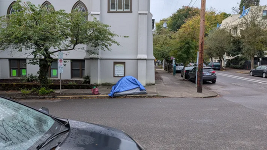 Camp on sidewalk reported at 7:32 am, 2 October 2025 near Northwest Irving Street and Northwest 19th Avenue