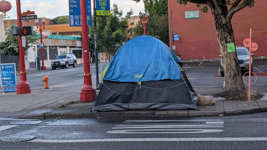 Camping on sidewalk reported at 4:45 pm, 1 October 2025 near Northwest Everett Street and Northwest 4th Avenue