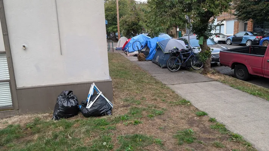 Campsite blocking sidewalk reported at 7:51 am, 3 October 2025 near Northwest 18th Avenue and Northwest Irving Street
