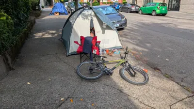 Tented camp with trash blocking sidewalk reported at 9:17 am, 24 August 2025 near